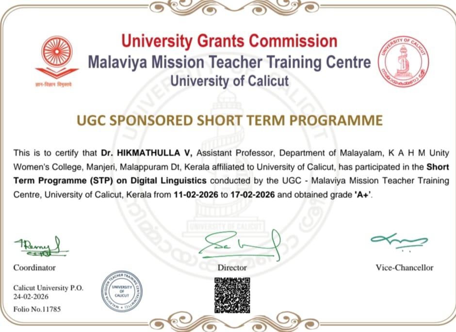 Dr. V. Hikmathulla, Assistant Professor, Department of Malayalam,successfully completed the UGC Sponsored Short Term Programme (STP) on Digital Linguistics conducted by the Malaviya Mission Teacher Training Centre, ...