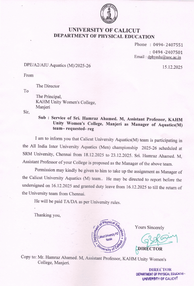 Mr. Hamraz Ahamed M, Assistant Professor & Head, Department of Physical Education, is proposed as the manager of the University Aquatics(M) team for the All India Inter University Aquatics men championship 2025-26 ...