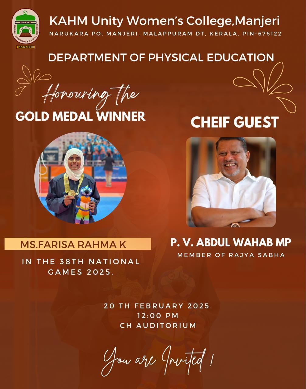 Happy news.. Farisa Rahma K of 2nd year B.Sc Computer science student Achieved gold Medal in 38th National Games held at Uttarakhand in the event Kalarippayattu (Sword and shield) for Kerala State team. This ...