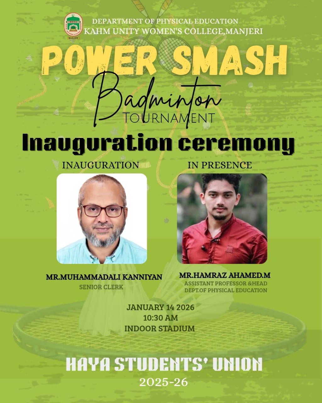 The Power Smash badminton tournament kicked off with a bang! 🌟 The inauguration session saw dignitaries like Muhammadali Kanniyan (Senior Clerk), Mr.Adham Thanari ( Senior Clerk) Mr. Hamraz Ahamed (Head, Dept. of ...