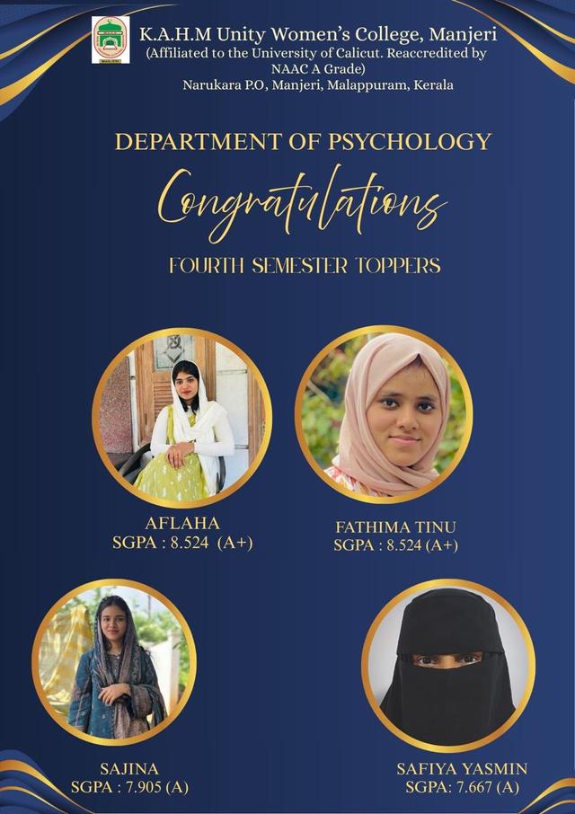 The department of psychology proud to announce that Gowri Krishna, a first-semester B.Sc. Psychology student at KAHM Unity Women’s College, Manjeri, has secured remarkable success at the 46th Malappuram District ...