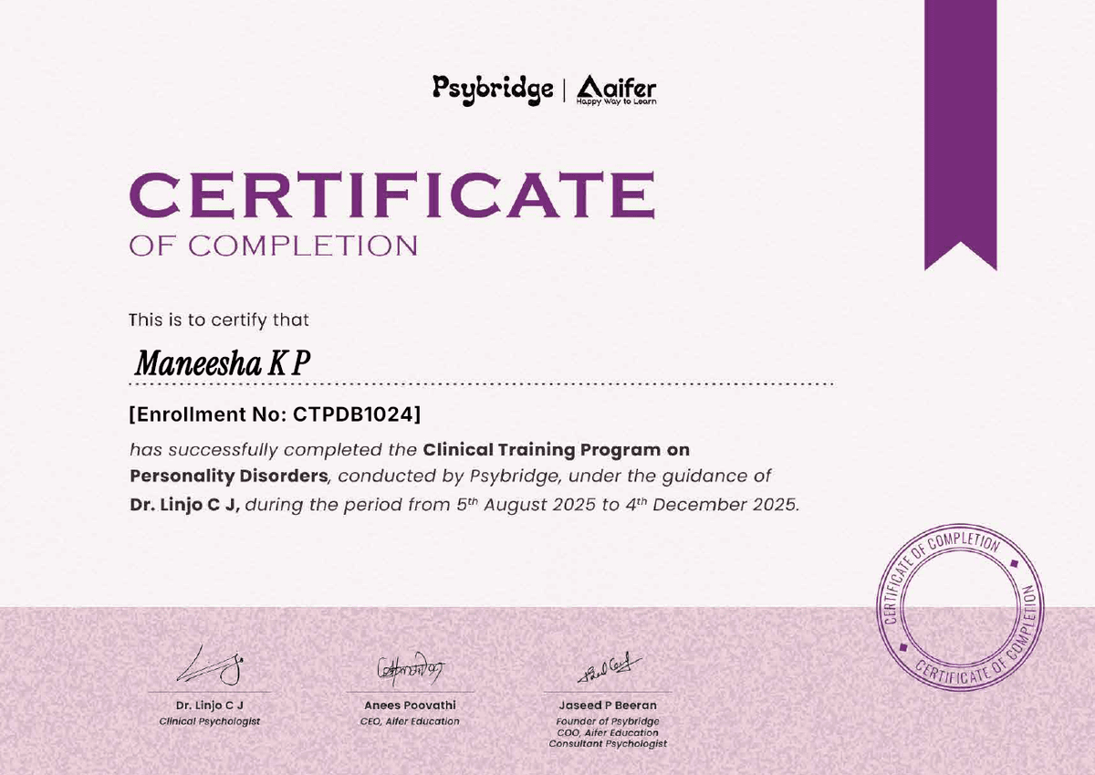 Maneesha K P, Assistant Professor and Head (Ad Hoc), Department of Psychology, KAHM Unity Women’s College Manjeri, completed a three-month certificate course in Clinical Training in Personality Disorders ...