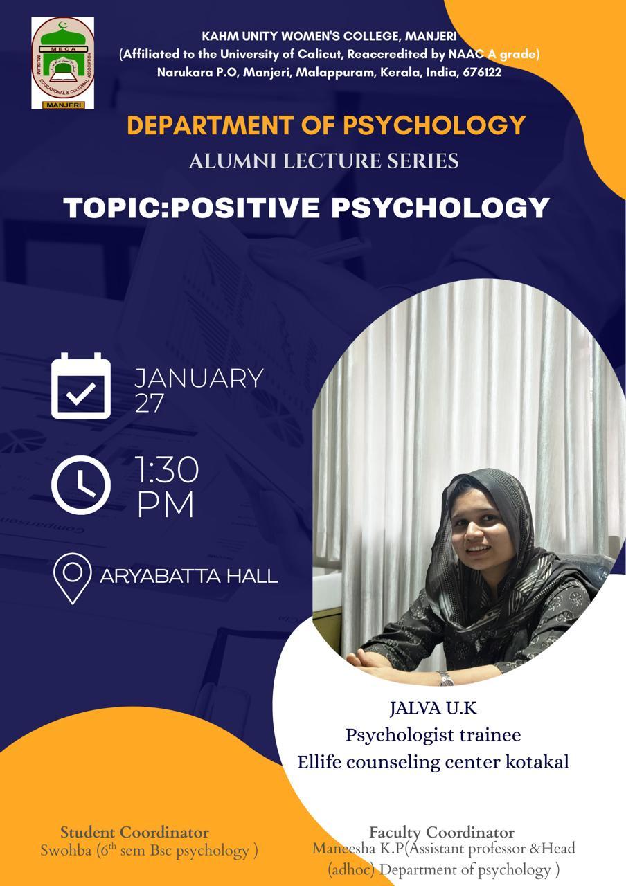 The Department of Psychology, KAHM Unity Women’s College, Manjeri, organized an Alumni Lecture Series on the topic “Positive Psychology” on 27 January at 1:30 PM in the Aryabatta Hall.The program was ...