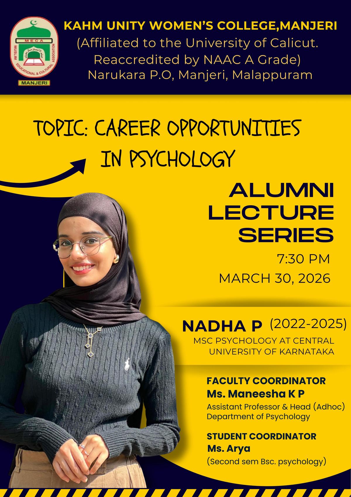 The Department of Psychology at KAHM Unity Women’s College, Manjeri, organized an Alumni Lecture Series on March 30, 2026, at 7:30 PM, focusing on the topic “Career Opportunities in Psychology.” The ...