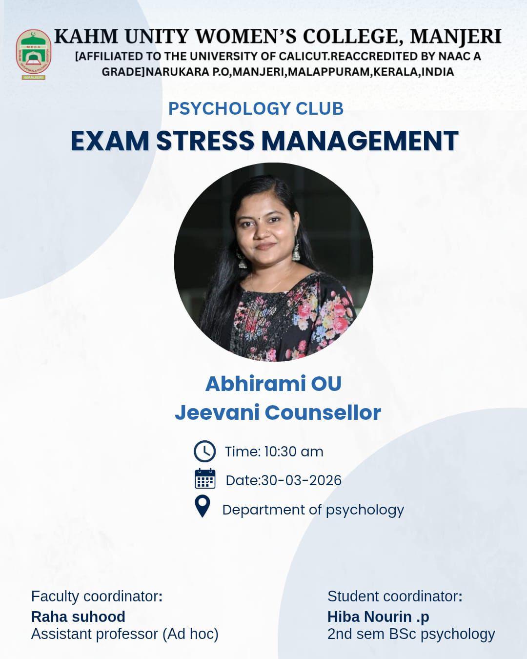 The Psychology Club of KAHM Unity Women’s College, Manjeri organized an Exam Stress Management Session on 30th March 2026 at 10:30 AM in the Department of Psychology. The programme aimed to equip students with ...