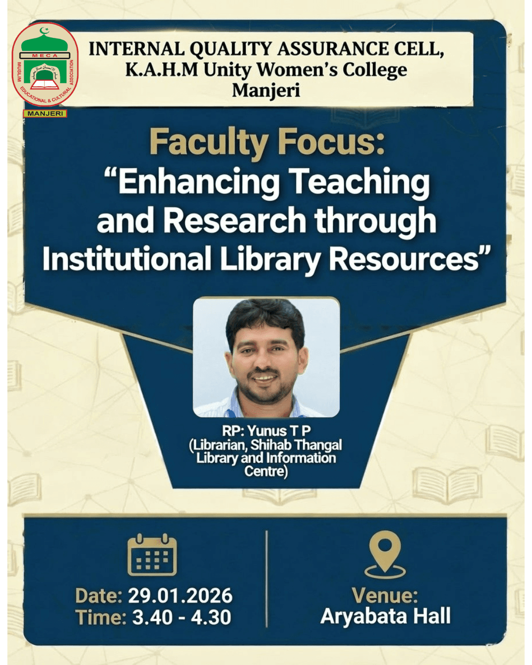 The Internal Quality Assurance Cell (IQAC) of K.A.H.M Unity Women’s College, Manjeri, organized a Faculty Focus Programme titled “Enhancing Teaching and Research through Institutional Library Resources” on 29 January 2026 at Aryabata Hall, from 3.40 p.m. to 4.30 p.m. The programme was conducted with ...