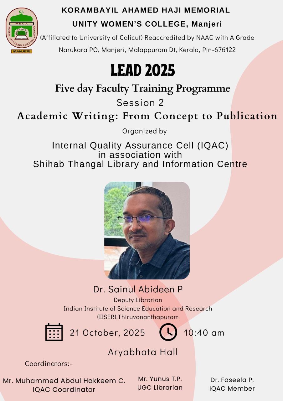 As part of the Five-day Faculty Training Programme – LEAD 2025, a session on 'Academic Writing: From Concept to Publication' was organized on 21st October 2025 at Aryabhata Hall by the Internal Quality Assurance Cell (IQAC) in association with the Shihab Thangal Library and Information Centre, KAHM Unity ...