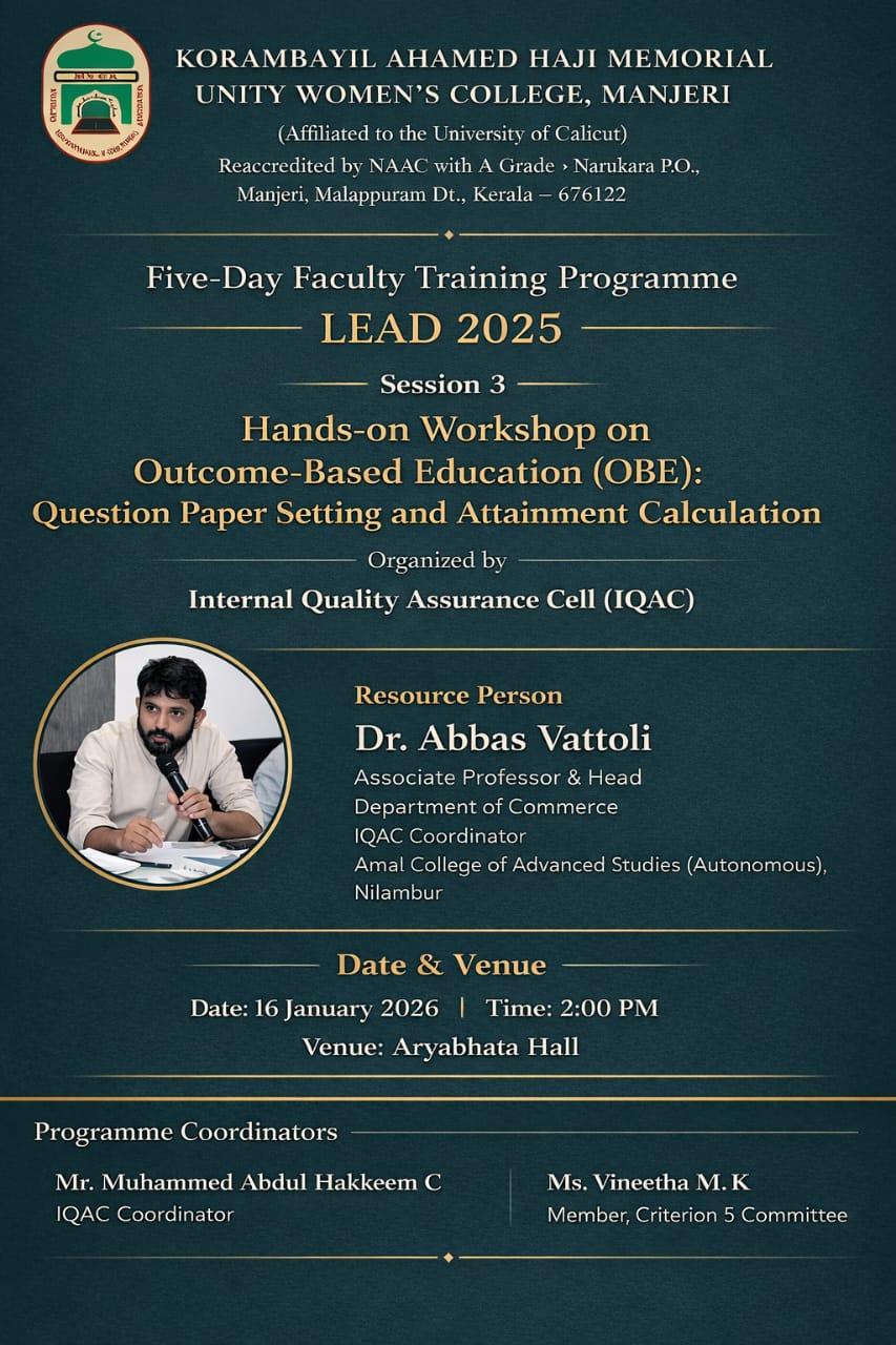 As part of the Five-Day Faculty Training Programme “LEAD 2025”, organized by the Internal Quality Assurance Cell (IQAC) of Korambayil Ahamed Haji Memorial Unity Women’s College, Manjeri, Session 3 was conducted successfully on 16 January 2026 at Aryabhata Hall. The session was led by Dr. Abbas ...