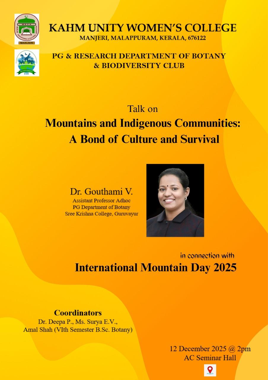 The PG and Research Department of Botany, KAHM Unity Women’s College, Manjeri, in association with the Biodiversity Club, celebrated ‘International Mountain Day’ on 12 December 2025 at 2:00 PM in Aryabhata Hall. The programme aimed to highlight the significance of mountains and to create awareness ...