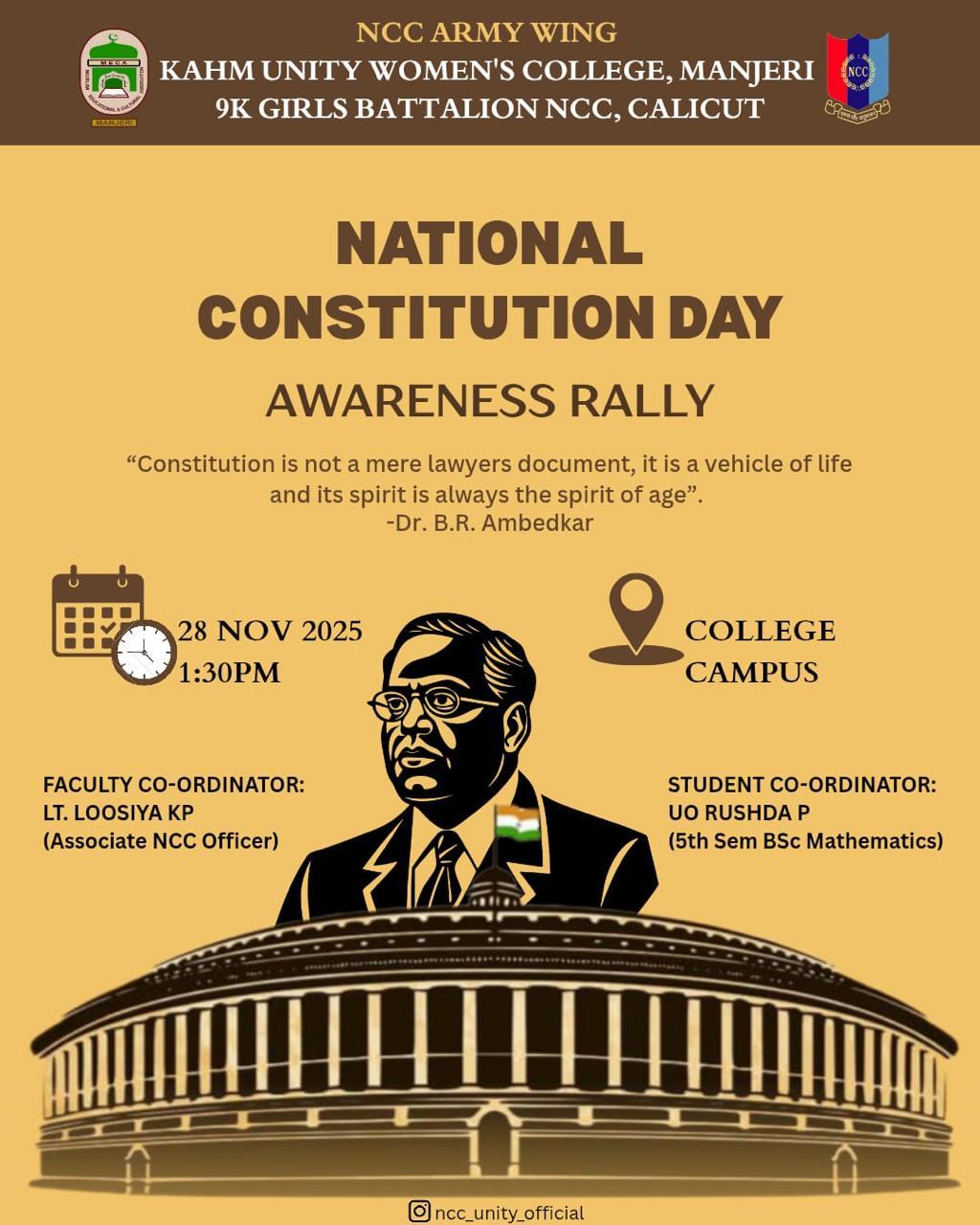 As part of the Indian Constitution Day observation, the NCC Army Wing of KAHM Unity Women’s College, Manjeri, under 9 (K) Girls Battalion NCC, Calicut, conducted an Awareness Rally and Preamble Reading Pledge on ...