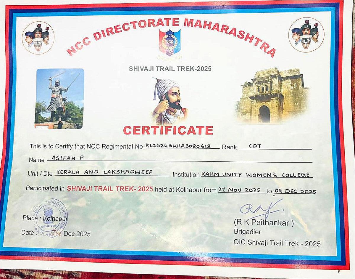 Proud Moment for Unity! 🌟 Our NCC cadets shine again at the All India Trekking Camp – Shivaji Trail Trek 2025. Congratulations Shahana MP & Asifah P