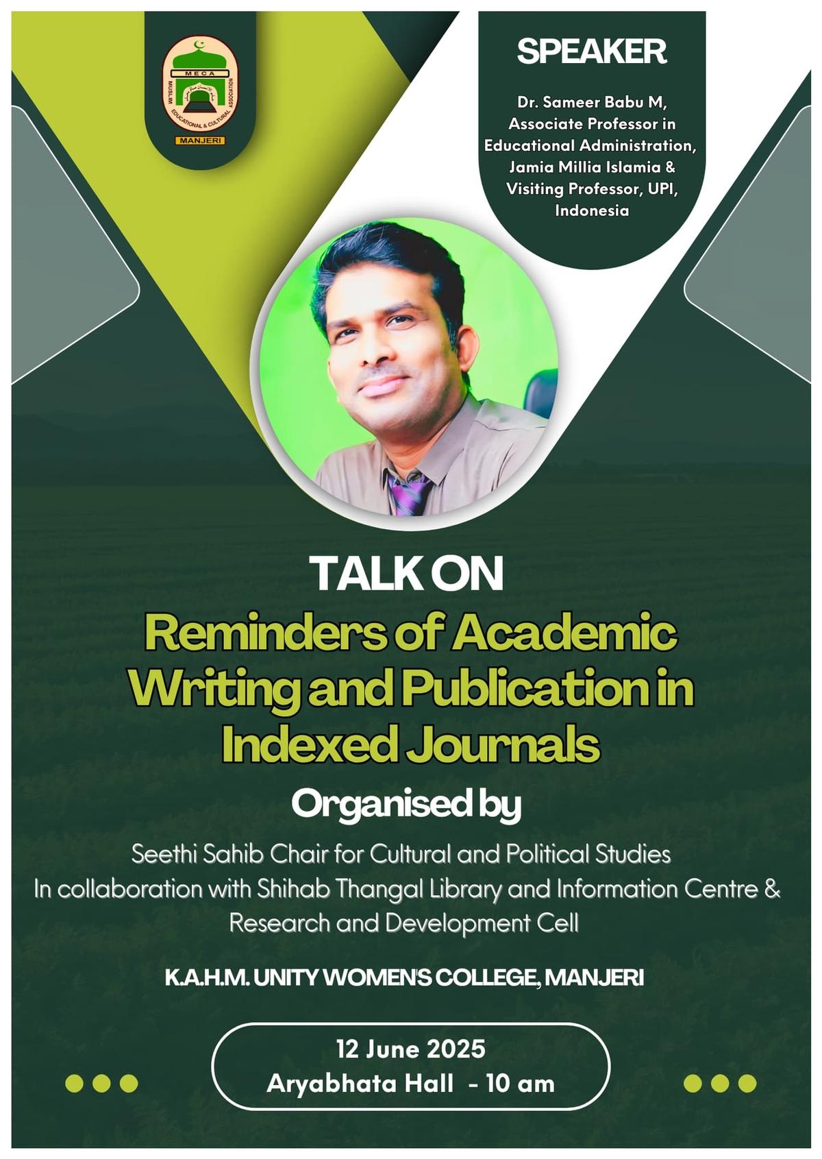 Report on the Talk on "Reminders of Academic Writing and Publication in Indexed Journals" Seethi Sahib Chair for Cultural and Political Studies, in collaboration with Shihab Thangal Library and Information Centre and the Research and Development Cell of K A H M Unity Women’s College, Manjeri, organized a ...
