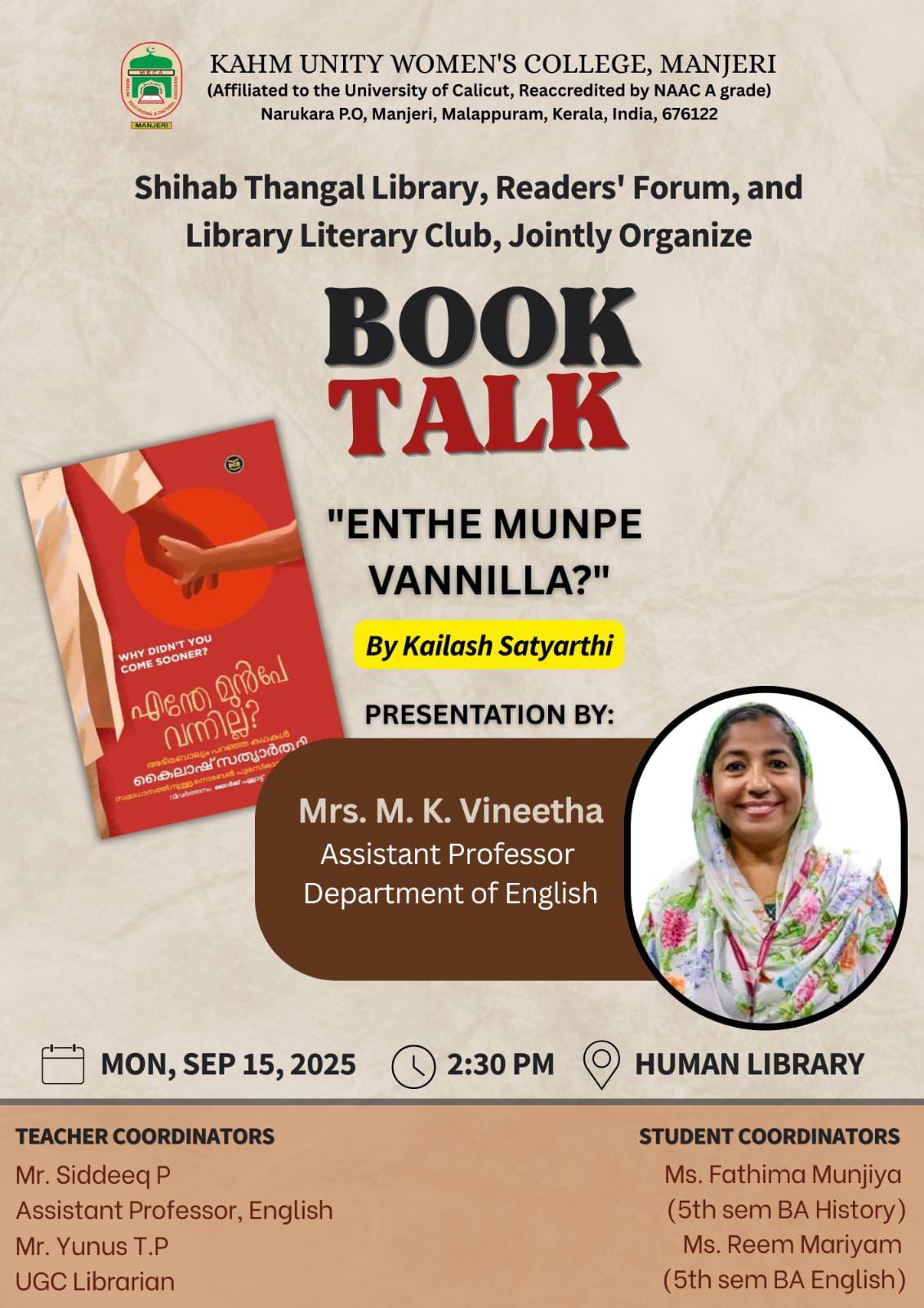 A book talk on “Ente Munpe Vannilla” by Nobel Laureate Kailash Satyarthi took place on 15th September 2025 at the Human Library. The event was organized by the Shihab Thangal Library, Readers’ Forum, ...