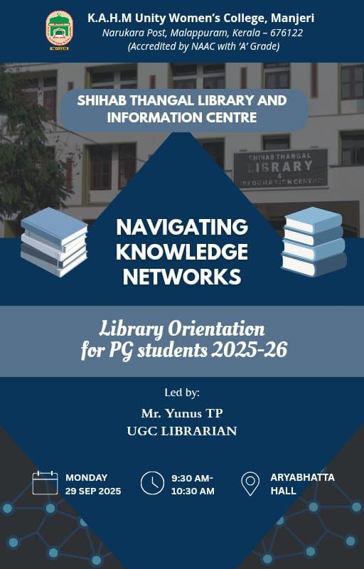 The Shihab Thangal Library and Information Centre of K.A.H.M Unity Women’s College, Manjeri, organized a Library Orientation Programme for PG students on Monday, September 29, 2025, at Aryabhatta Hall. The session, ...