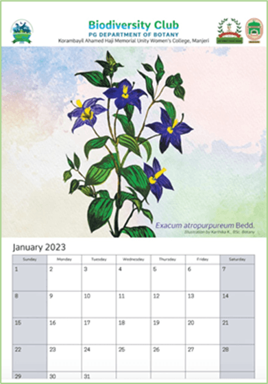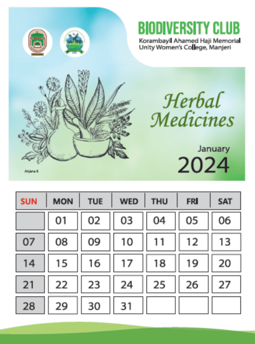 Medicinal herbs illustrated calendar 2024 released on 12th January 2024 that included the illuctrations of 12 medicinal herbs. Illustrations contributed by Anjana K., Joint Coordinator of Biodiversity Club, 2022-2023. ...