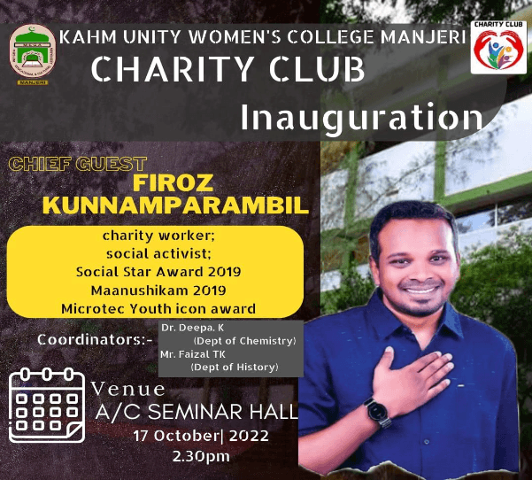 The Charity Club of 2022 was inaugurated at 2:30 PM on October 17, 2022. The formalceremony was graced by renowned charity figure, Mr. Firoz Kunnamparambil, who had the honor ofofficially launching the club. Dr. Deepa K, ...