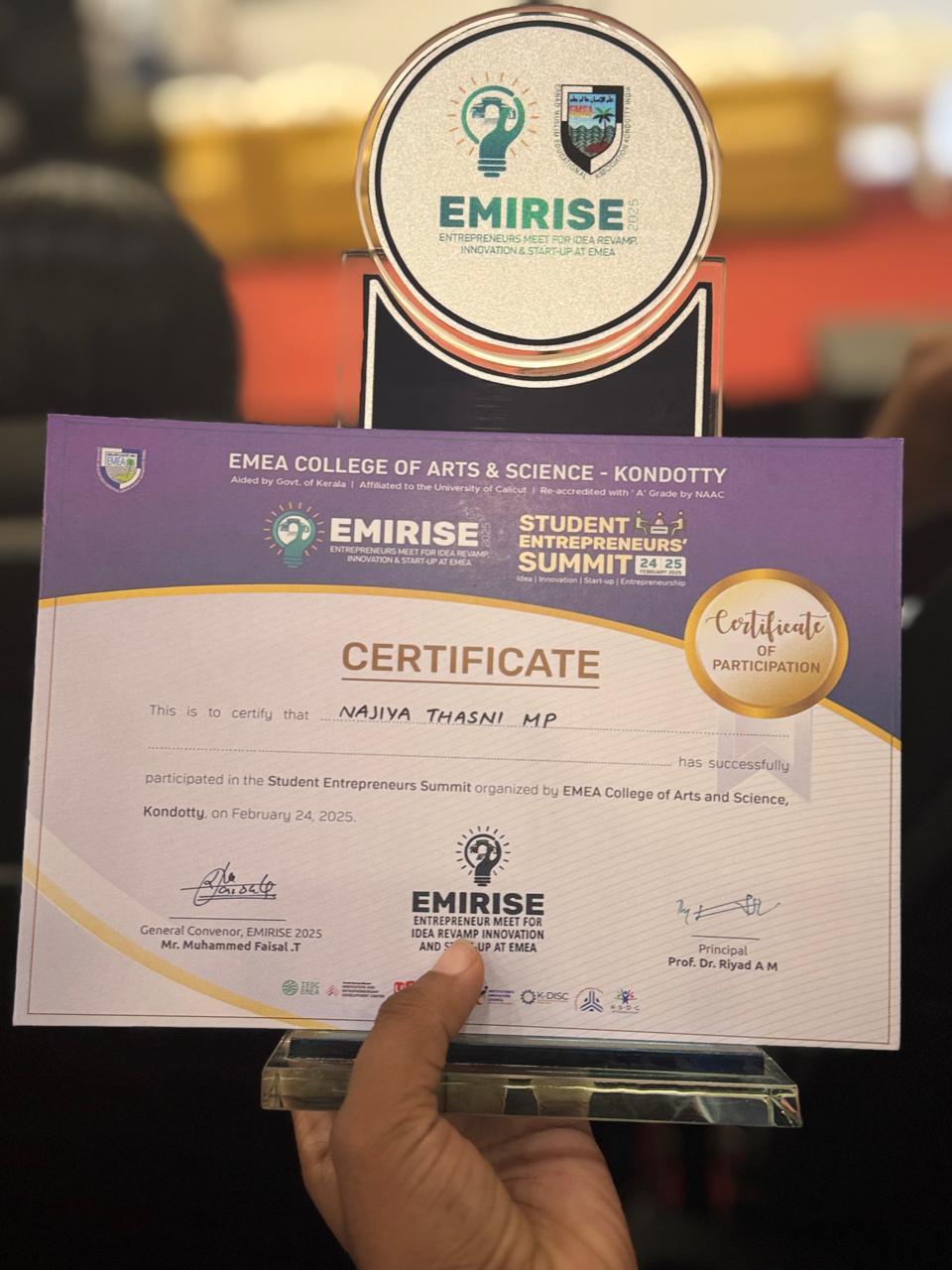 ED Club Member Najiya Thasni MP, Fourth Sem BCom Co-operation attended “STUDENT ENTREORENEURS’ SUMMIT held at EMEA College , Kondotty on 24th February 2025 and received Entrepreneurs award.