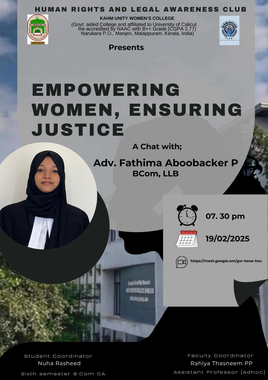 The Human Rights and Legal Awareness Club of KAHM Unity Women’s College, Manjeri, organized a talk titled Empowering Women, Ensuring Justice on 19th February 2025 at 7:30 PM via Google Meet. The session featured Adv. Fathima Aboobacker P (BCom, LLB) as the guest speaker and aimed to educate participants about ...