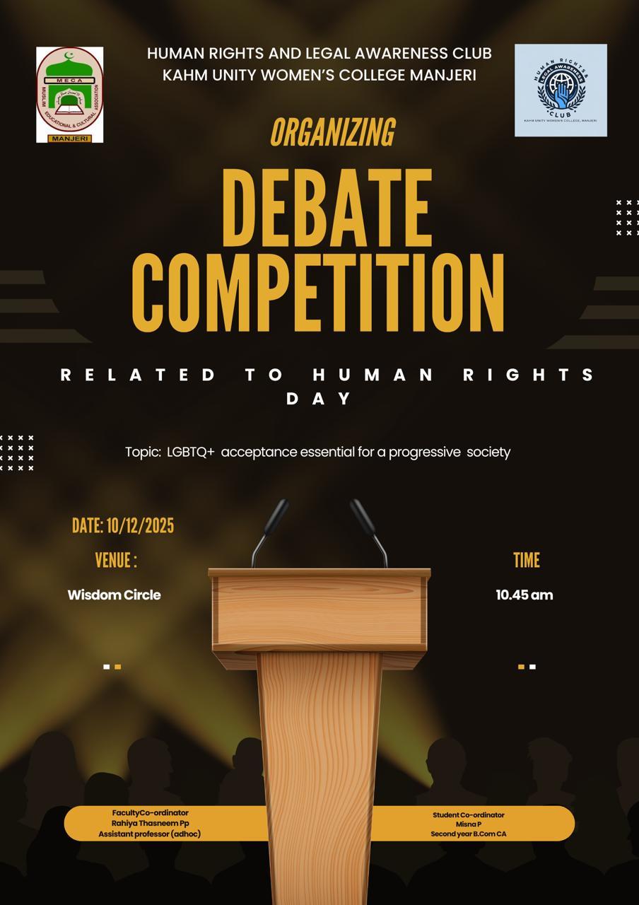 The Human Rights and Legal Awareness Club of KAHM Unity Women’s College, Manjeri organized a Debate Competition on 10th December 2025, in connection with Human Rights Day. The event was conducted at the Wisdom ...