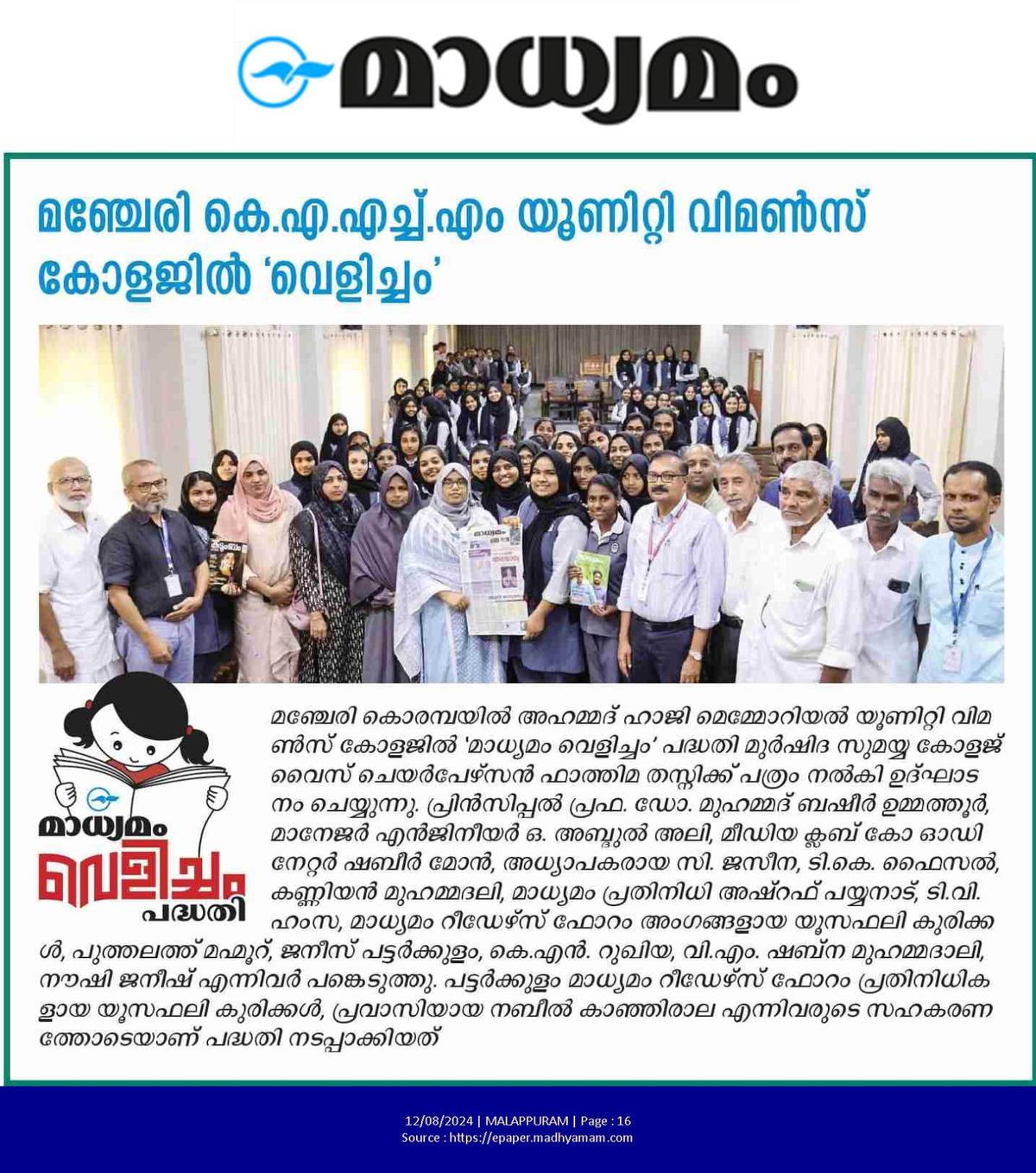 On 8th August 2024, Engineer O Abdul Ali, manager, Unity Women’s College, inaugurated the Madhyayam Velicham Project at KAHM Unity Women’s College Manjeri. He reminded the students that a culturally healthy society can be formed only by making them reading. Murshida Sumayya, a resident of Pattarkulam, ...