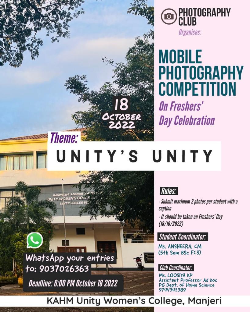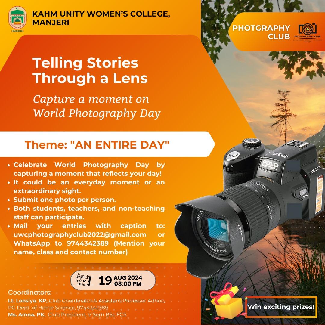The Photography Club of KAHM Unity Women's College, Manjeri, conducted a photography competition on August 19, 2024, as part of World Photography Day. The theme of the competition was "An Entire Day." The aim of the competition was to encourage students to showcase their photography skills, and the objective was to ...