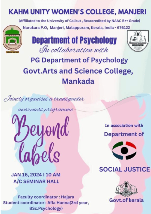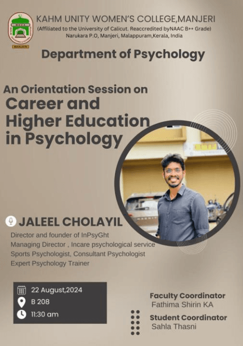 The Psychology Club at KAHM Unity Women's College, Manjeri, is a vibrant community dedicated to exploring the fascinating world of human behavior and mental processes. Our club provides a platform for students to engage in thought-provoking discussions, interactive workshops, guest lectures, and hands-on activities that deepen their understanding of psychology beyond textbooks.