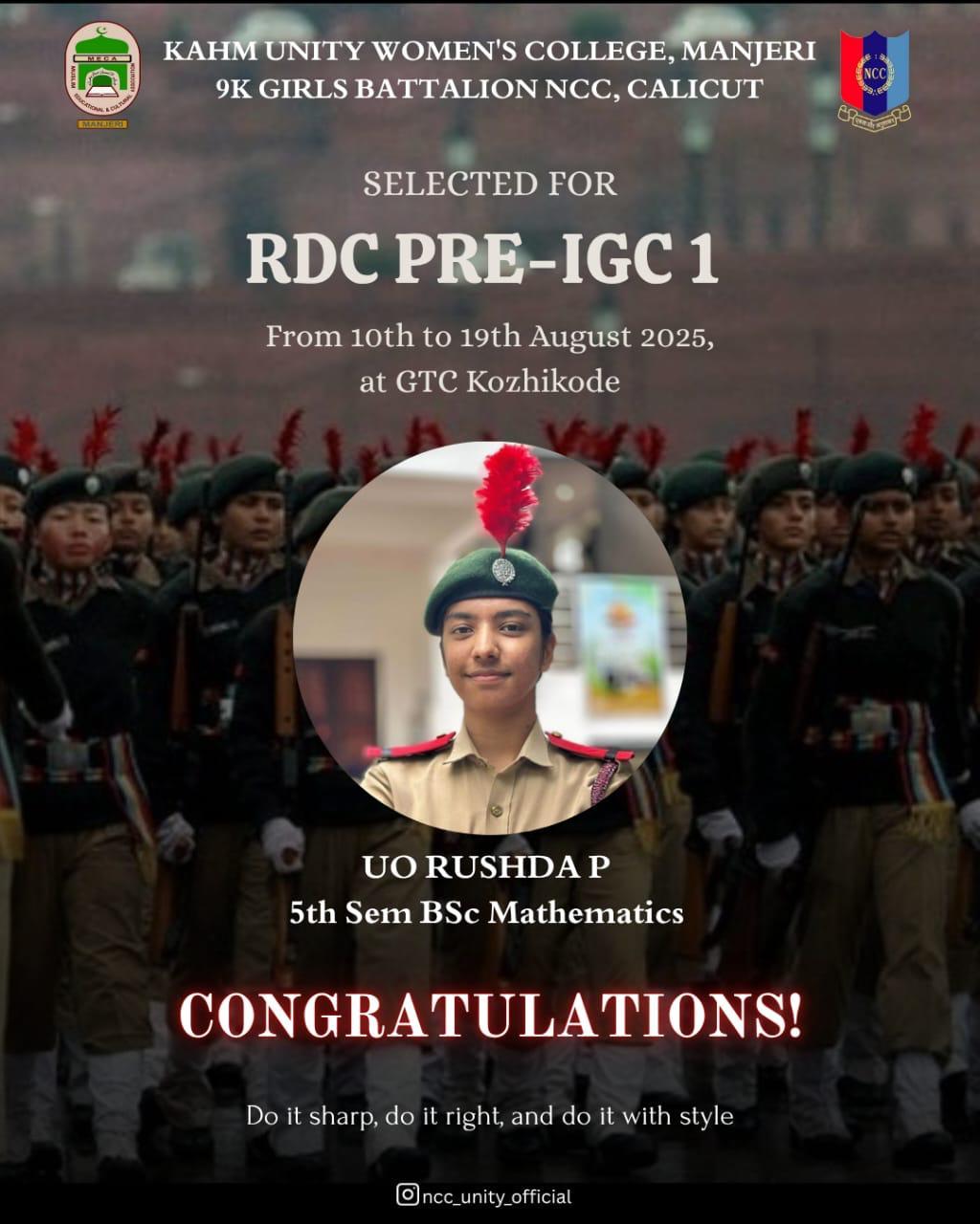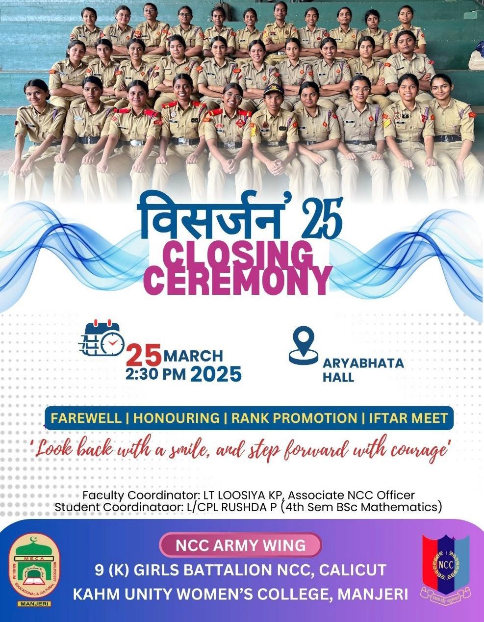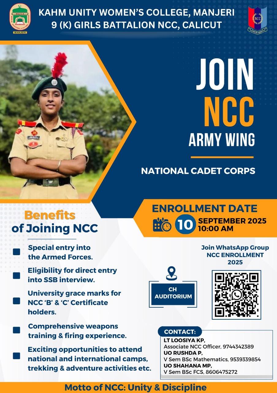 The NCC Army Wing of KAHM Unity Women’s College, Manjeri, under the 9 (K) Girls Battalion NCC, Calicut, conducted the NCC Enrollment 2025 for first-year degree students on 10 September 2025 in the CH Auditorium. The aim of the enrollment was to provide opportunities for students to join the National Cadet Corps, ...