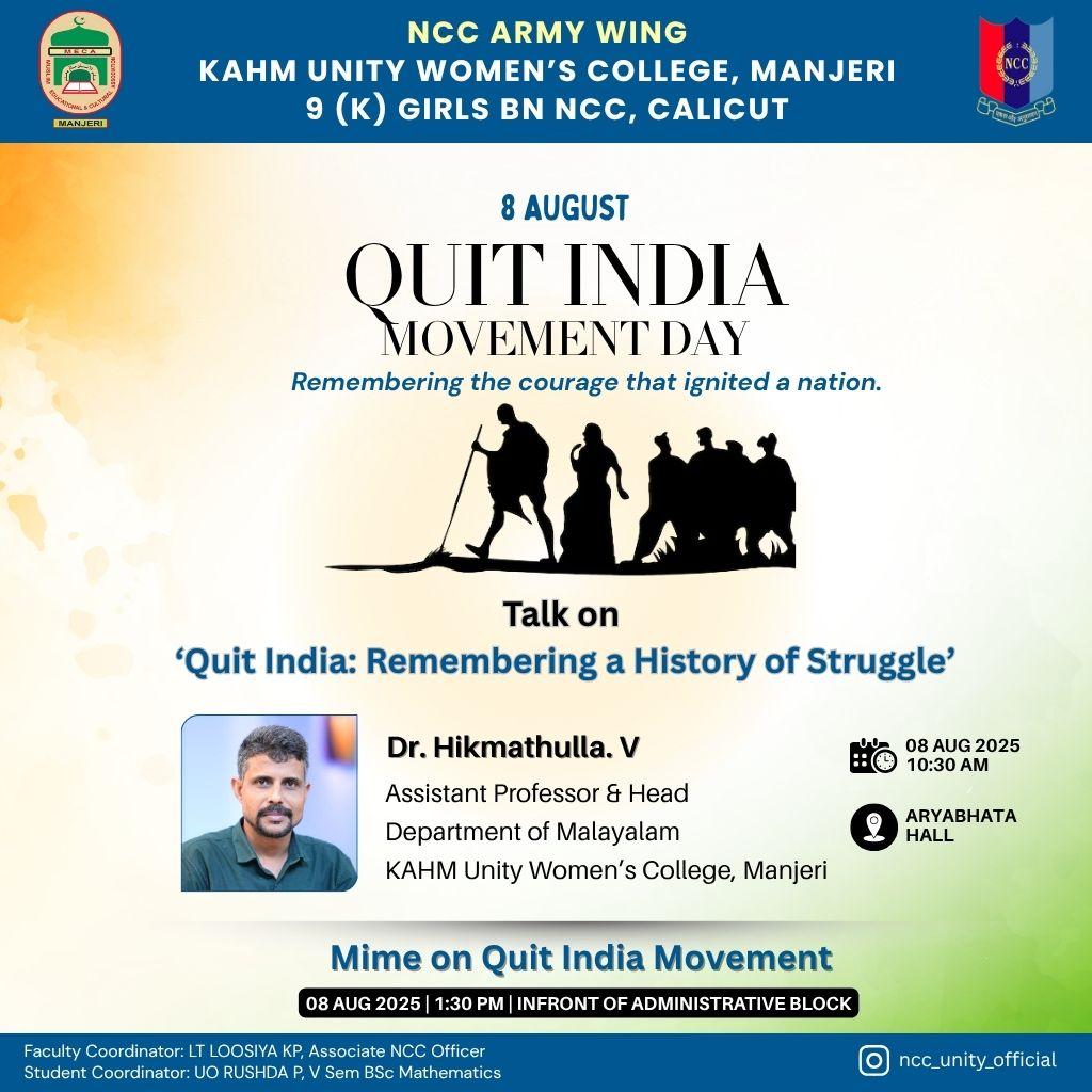 As part of Quit India Movement Day observation, the NCC Army Wing organized a talk and mime show on August 8, 2025. The aim of the event was to commemorate the Quit India Movement and highlight its historical significance and relevance. The objectives of the programme were to educate cadets about the movement's ...
