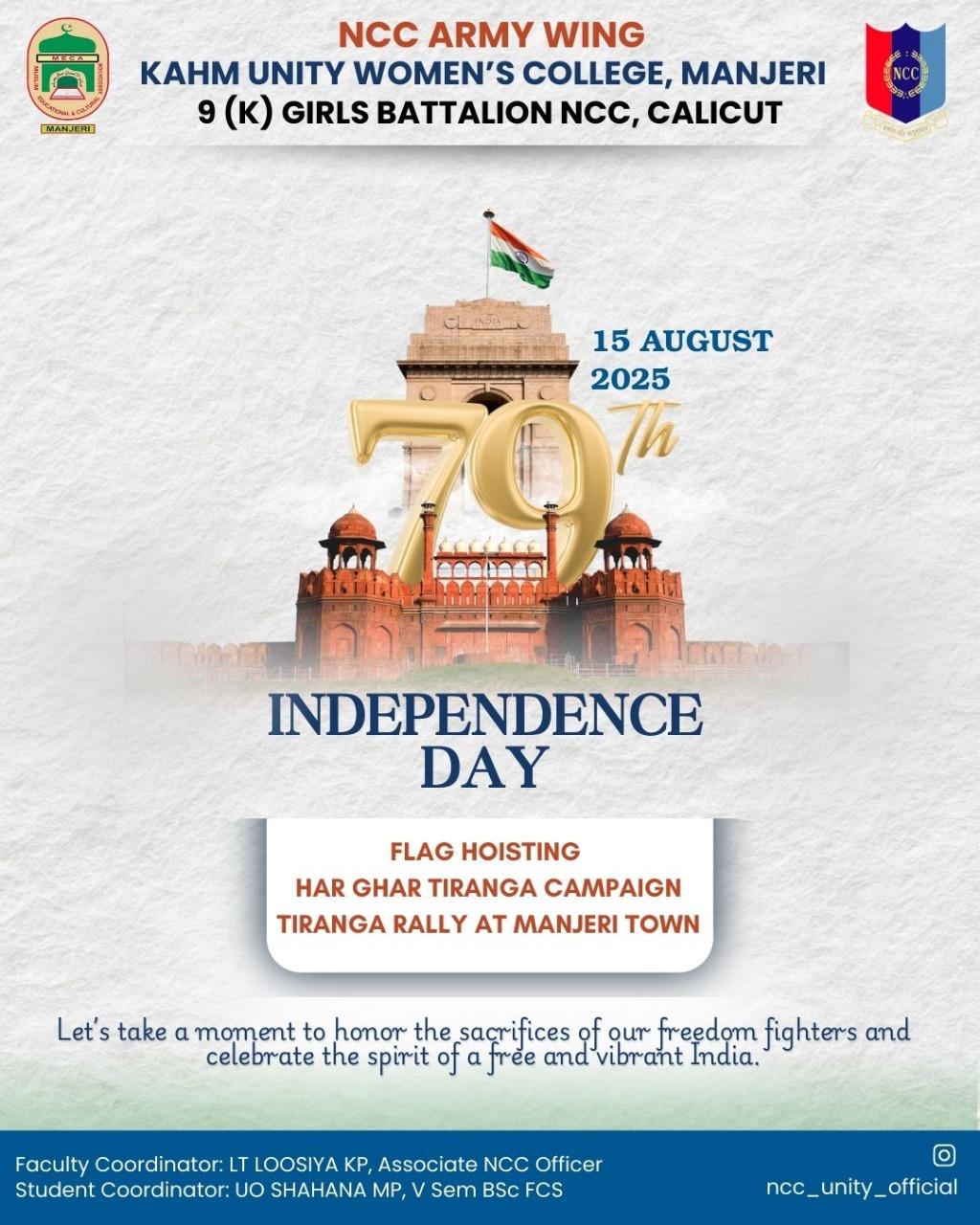 The NCC Army Wing of KAHM Unity Women’s College, Manjeri celebrated the 79th Independence Day on 15 Aug 2025. The aim of the celebration was to commemorate India's Independence Day, instill patriotism among NCC ...