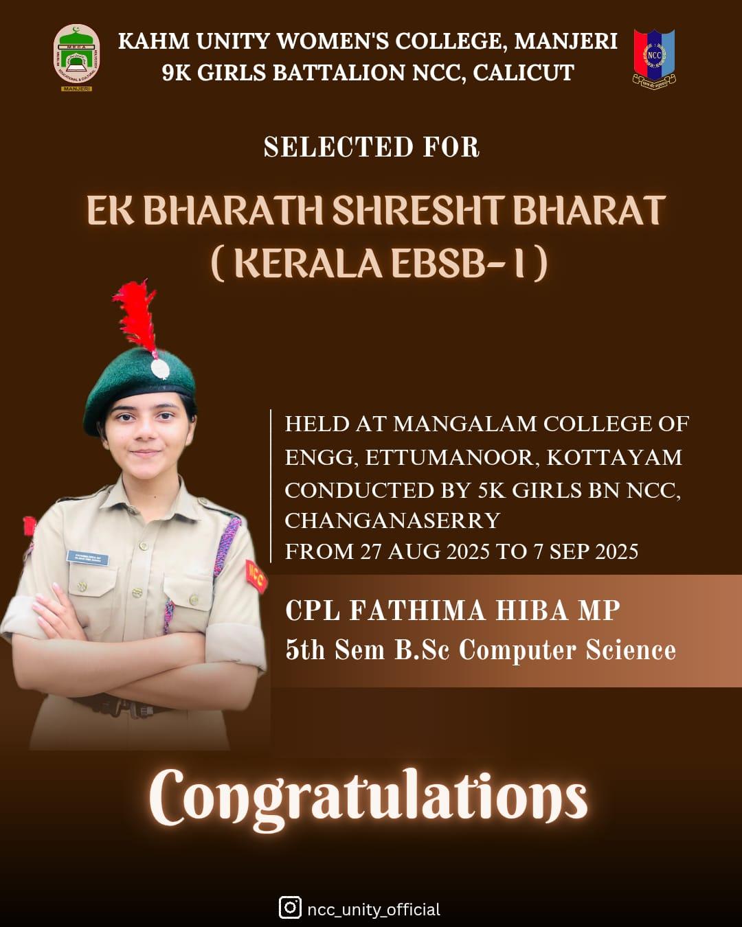 Congratulations to CPL Fathima Hiba MP for being selected for the prestigious Ek Bharat Shreshth Bharat (Kerala EBSB-1) camp