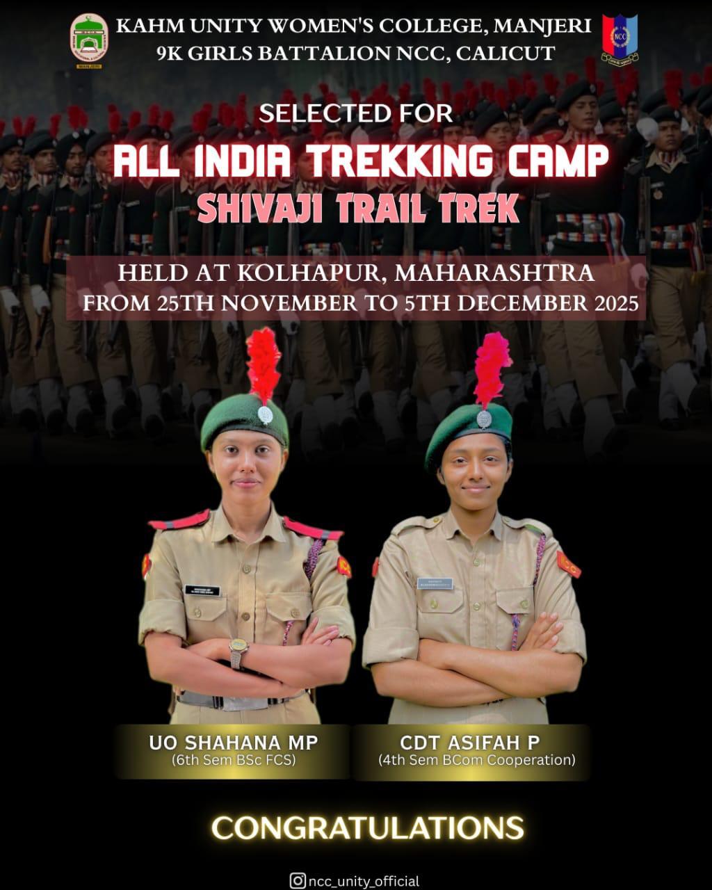 Proud Moment for Unity! 🌟 Our NCC cadets shine again at the All India Trekking Camp – Shivaji Trail Trek 2025. Congratulations Shahana MP & Asifah P
