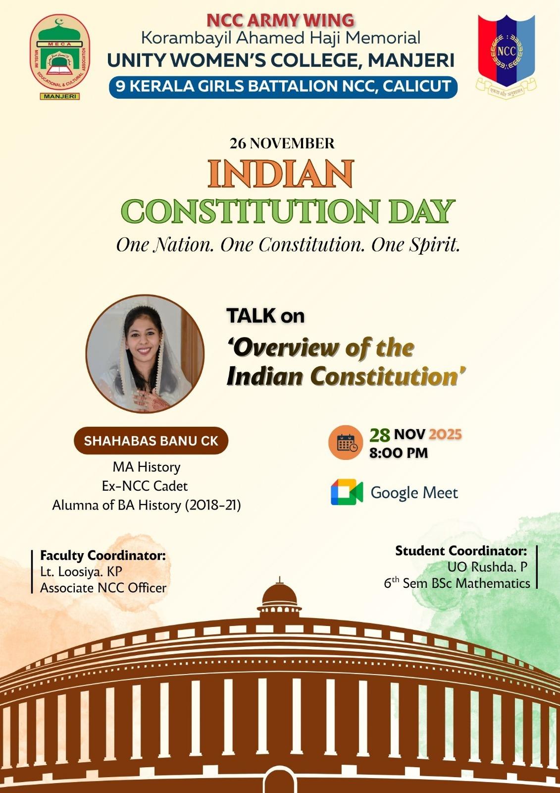 As part of the Indian Constitution Day observation, the NCC Army Wing of KAHM Unity Women’s College, Manjeri, under 9 (K) Girls Battalion NCC, Calicut, conducted an online talk on “Overview of the Indian ...