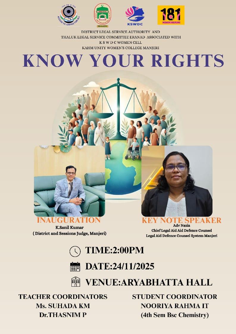 The "Know Your Rights" legal awareness seminar, organized by the KSWDC Women Cell on 24 November 2025, was a comprehensive initiative to empower women students with knowledge of their constitutional rights, legal ...
